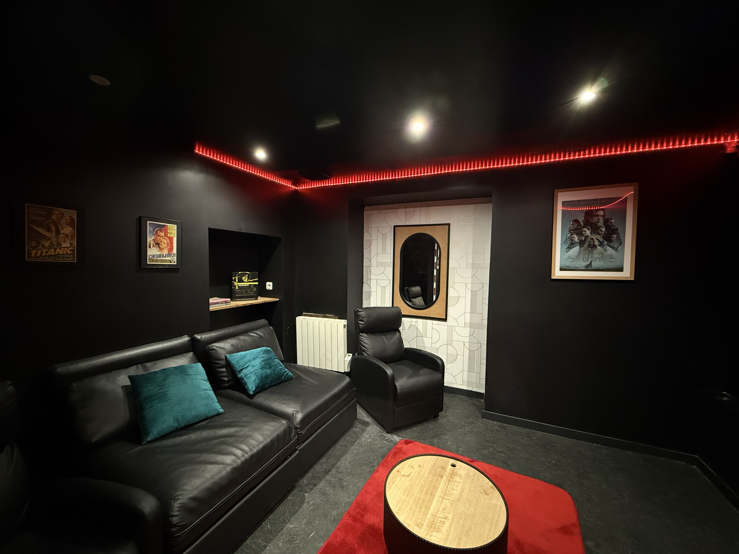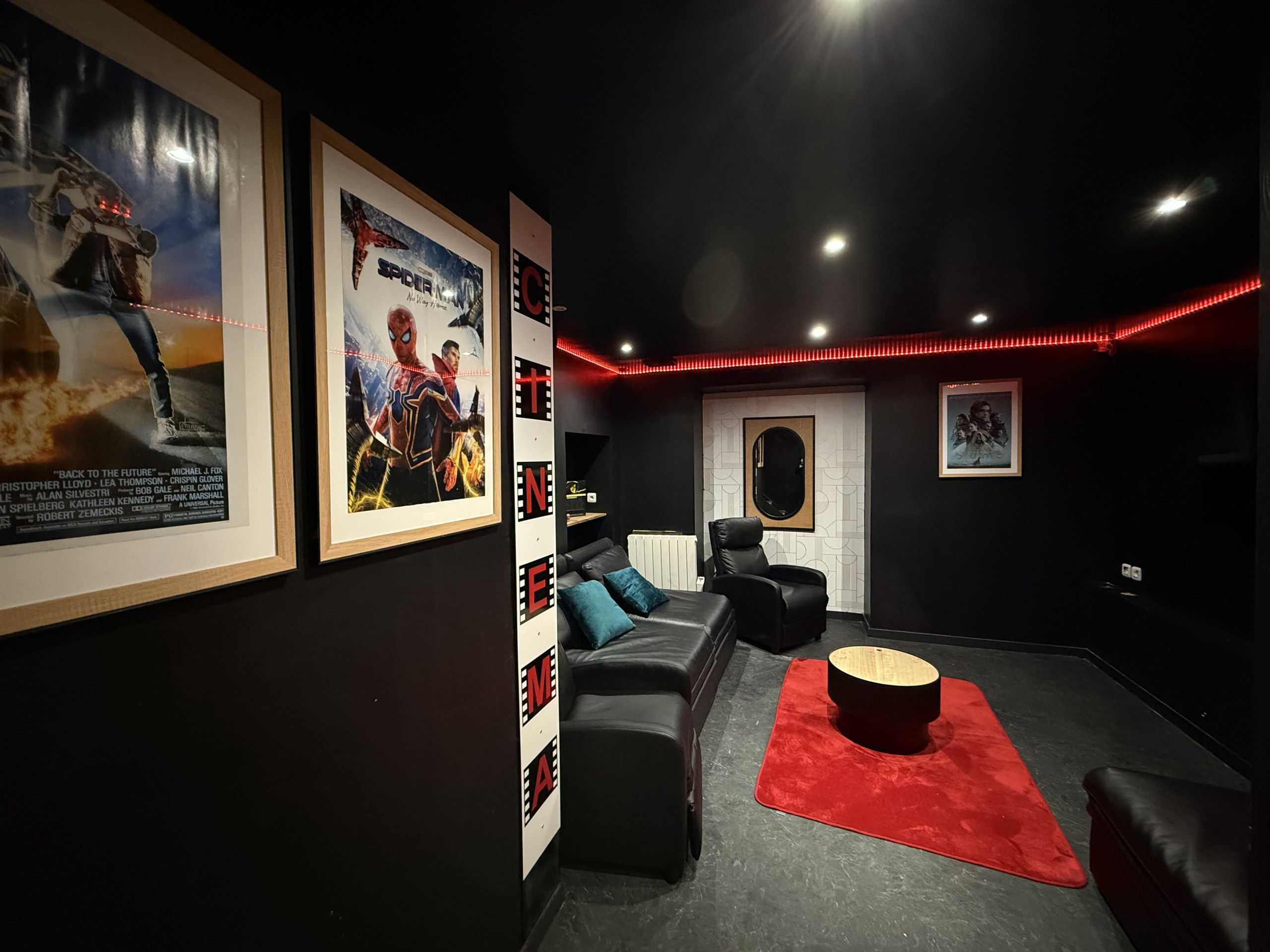 In de kelder bevindt zich een bioscoopruimte, in de Star Wars-sfeer, met een tv van 70 inch.