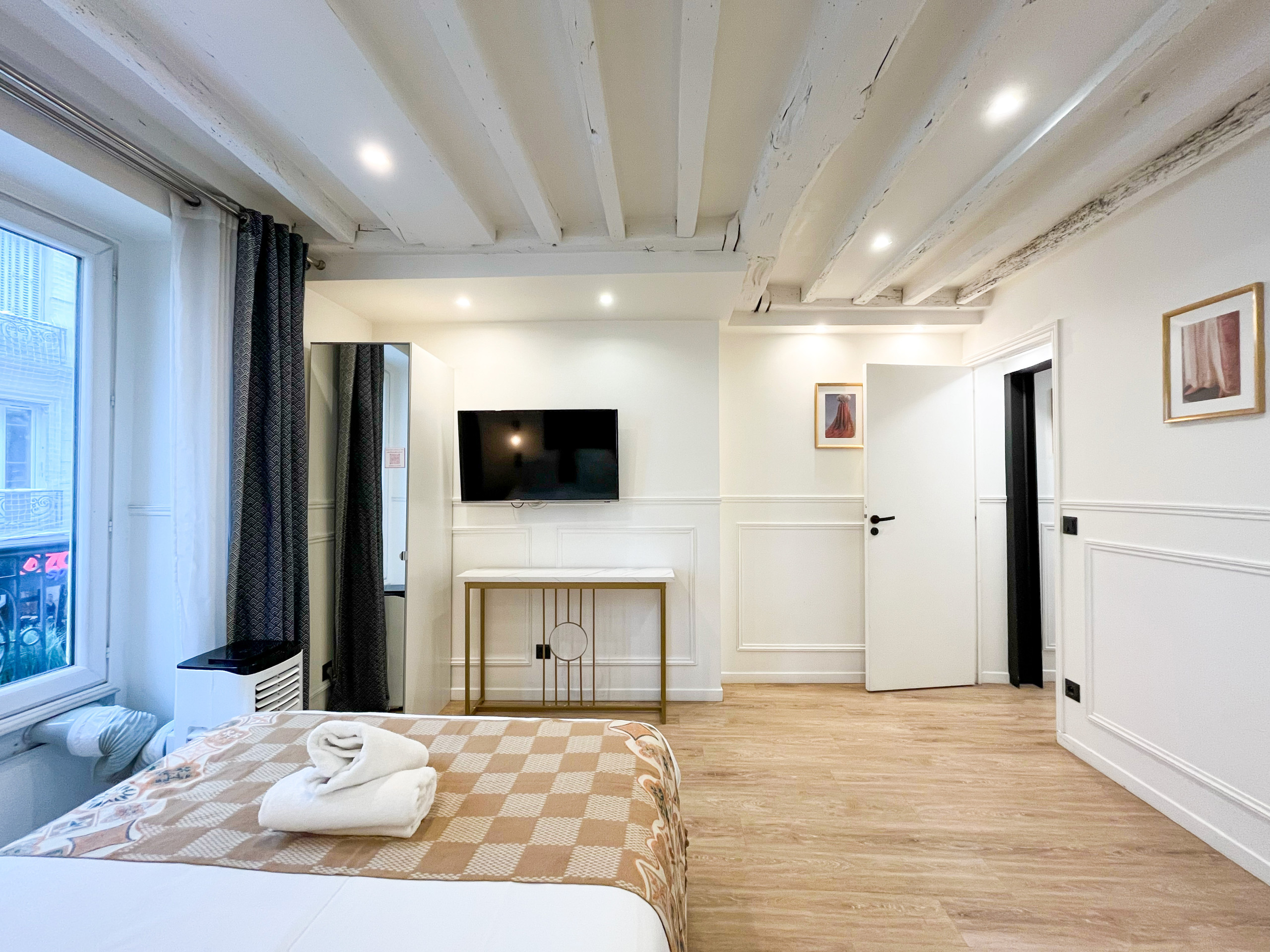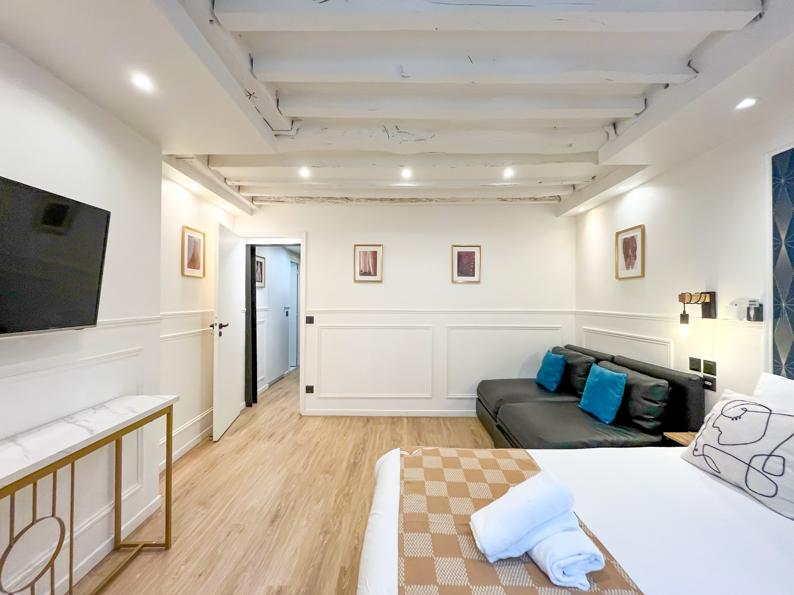 Je zult ook het design in wit en grijstinten van ons appartement waarderen, evenals de zichtbare balken die bijdragen aan de warme en gastvrije sfeer van de ruimte, met desalniettemin een vleugje moderniteit.