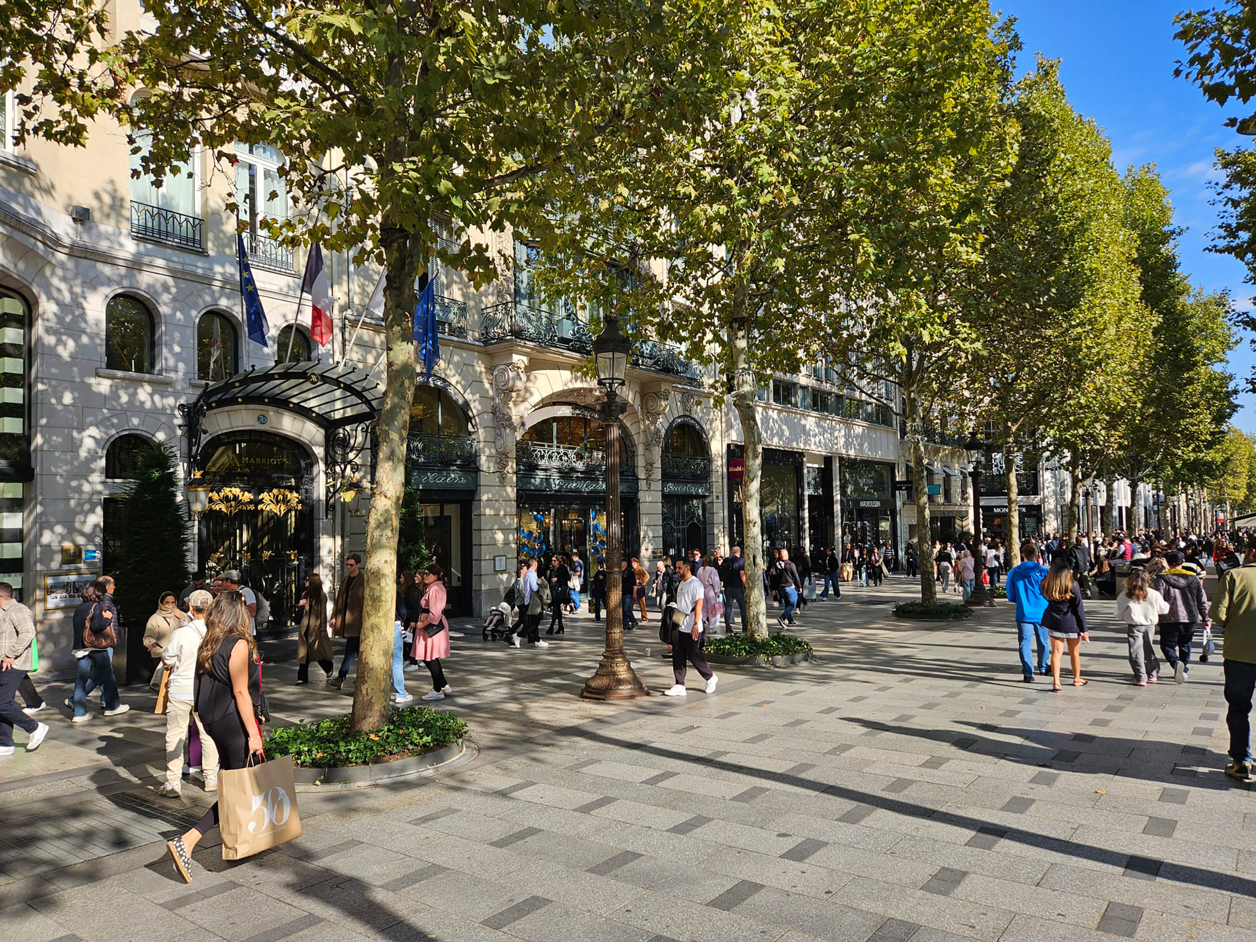 Turisti e parigini passeggiano a tutte le ore del giorno e della notte, d'estate come d'inverno, su questo tratto emblematico di quasi 2 chilometri, tra la place de la Concorde e l'Arco di Trionfo.