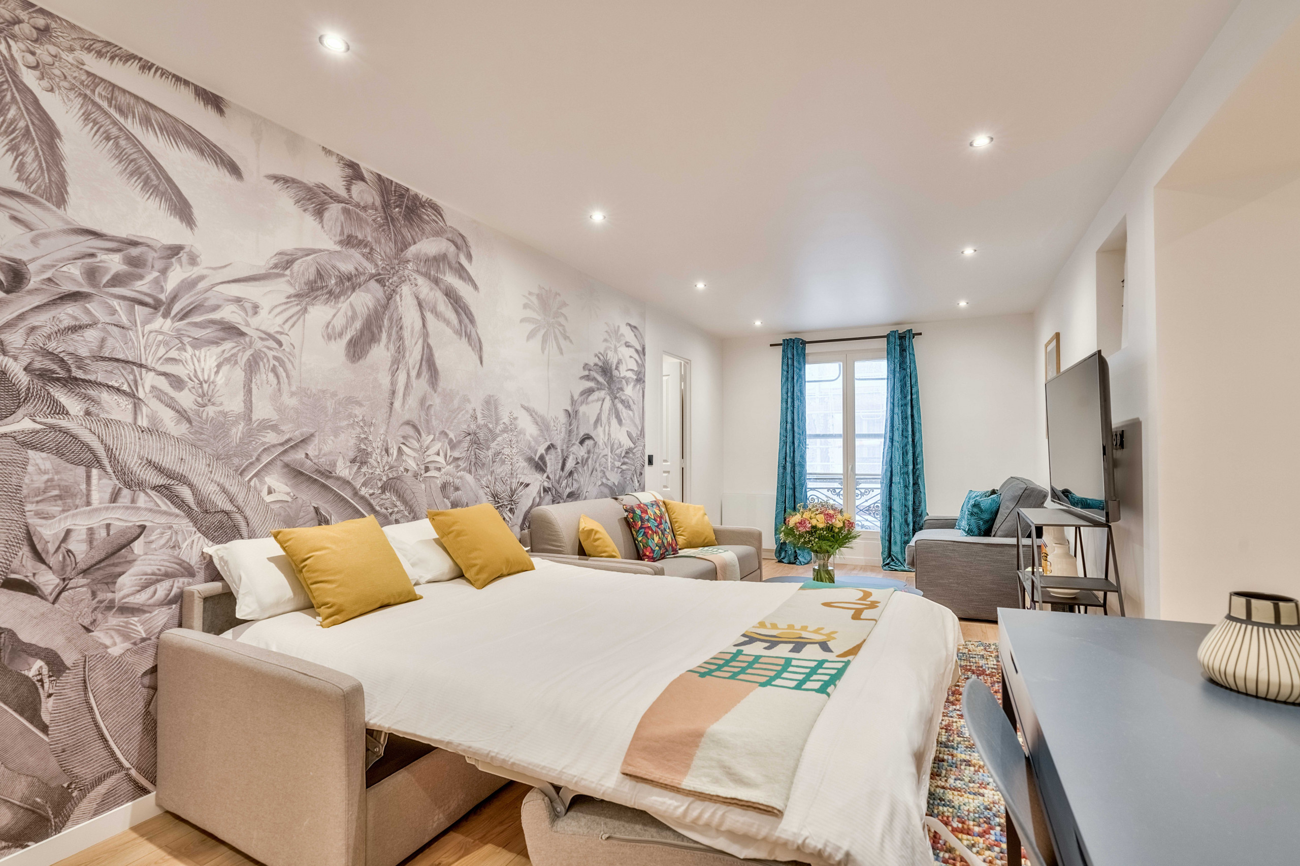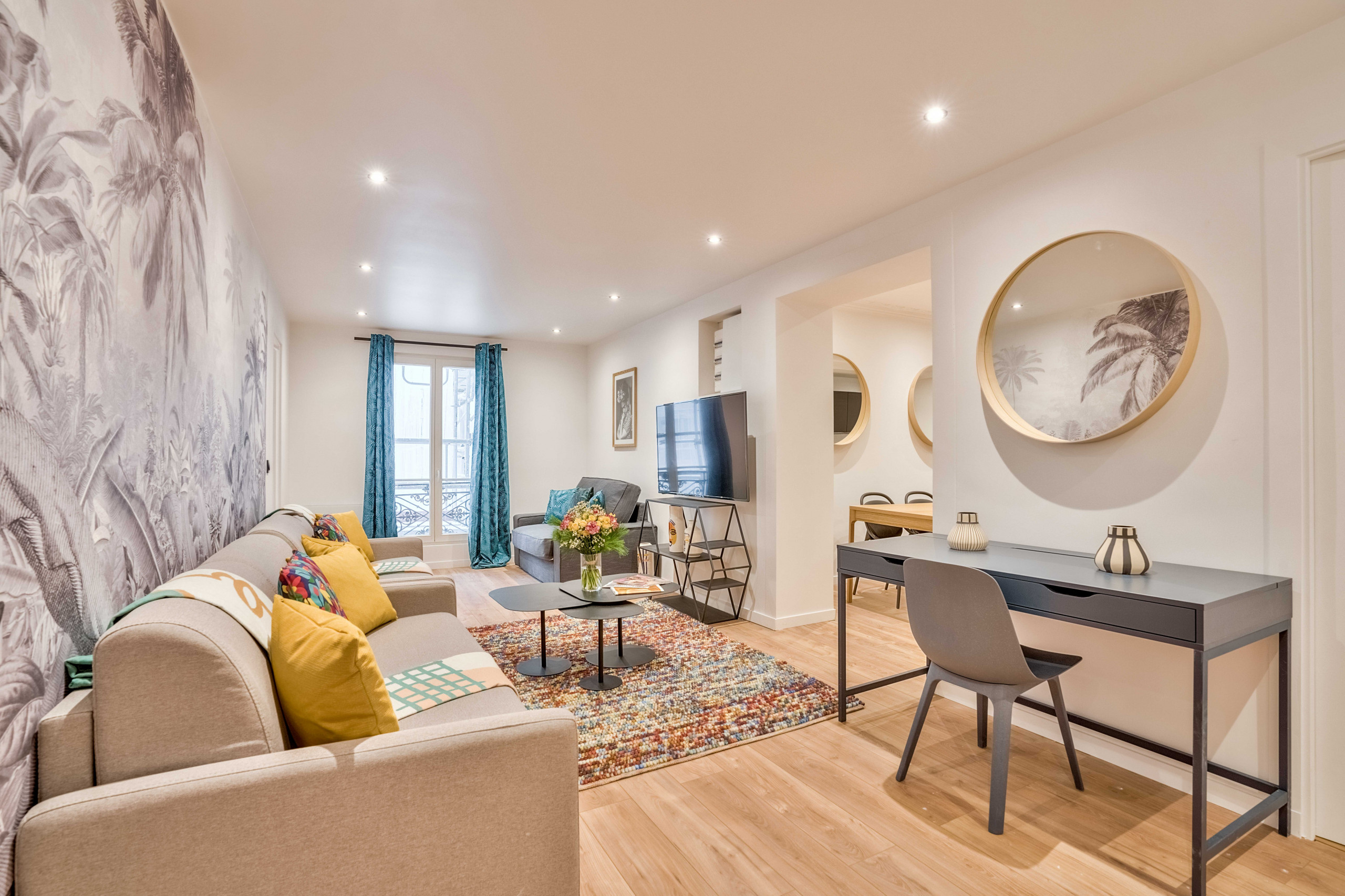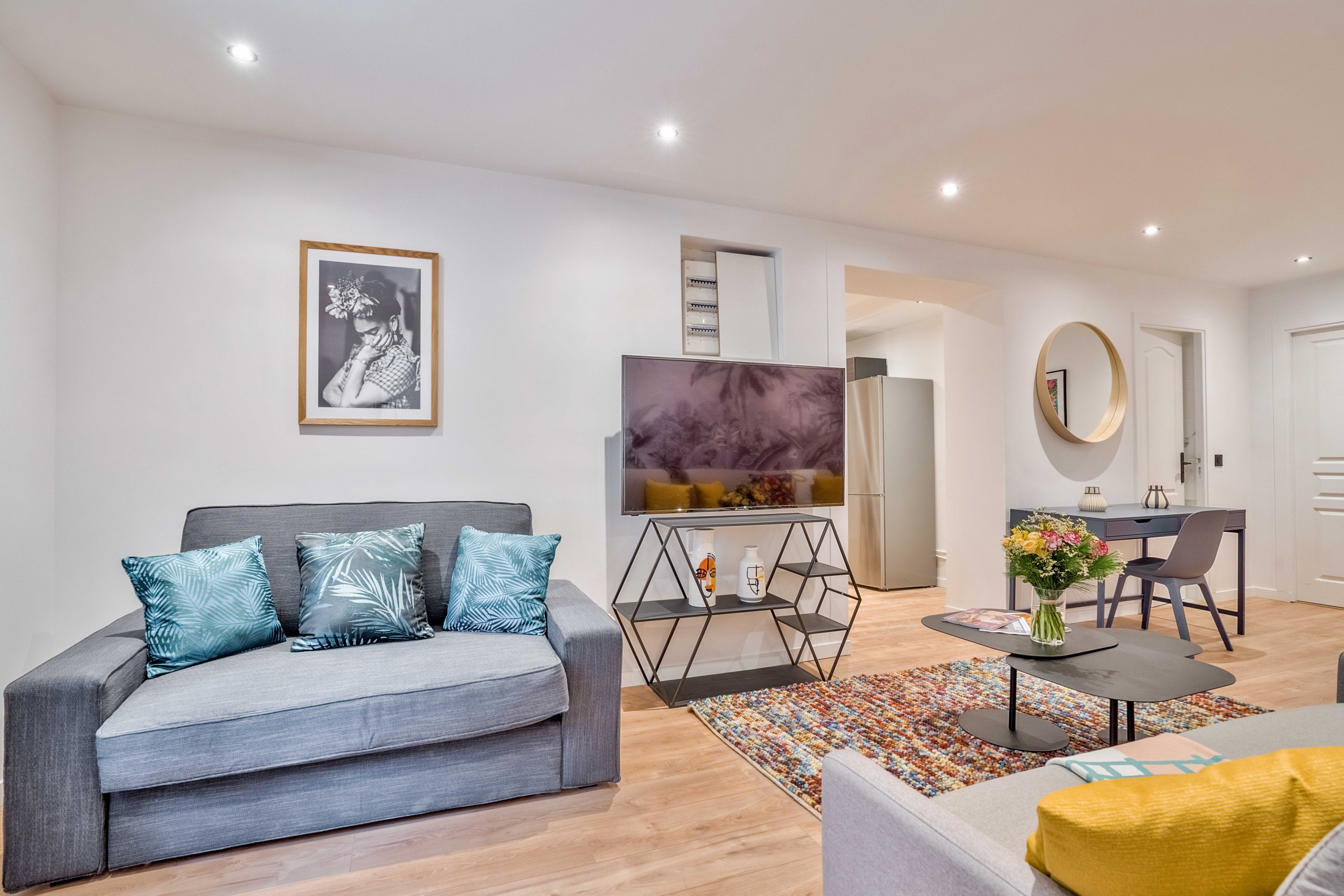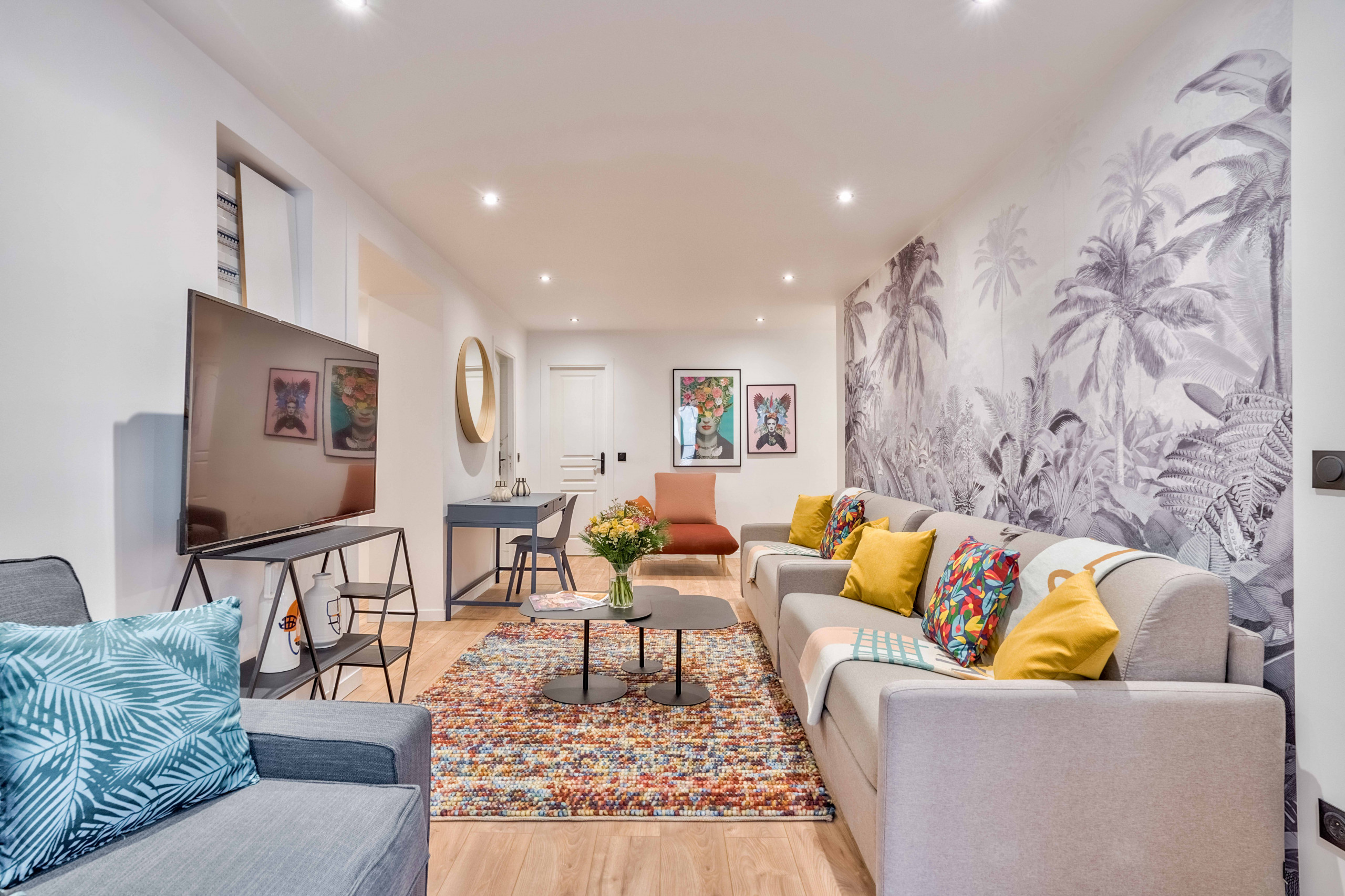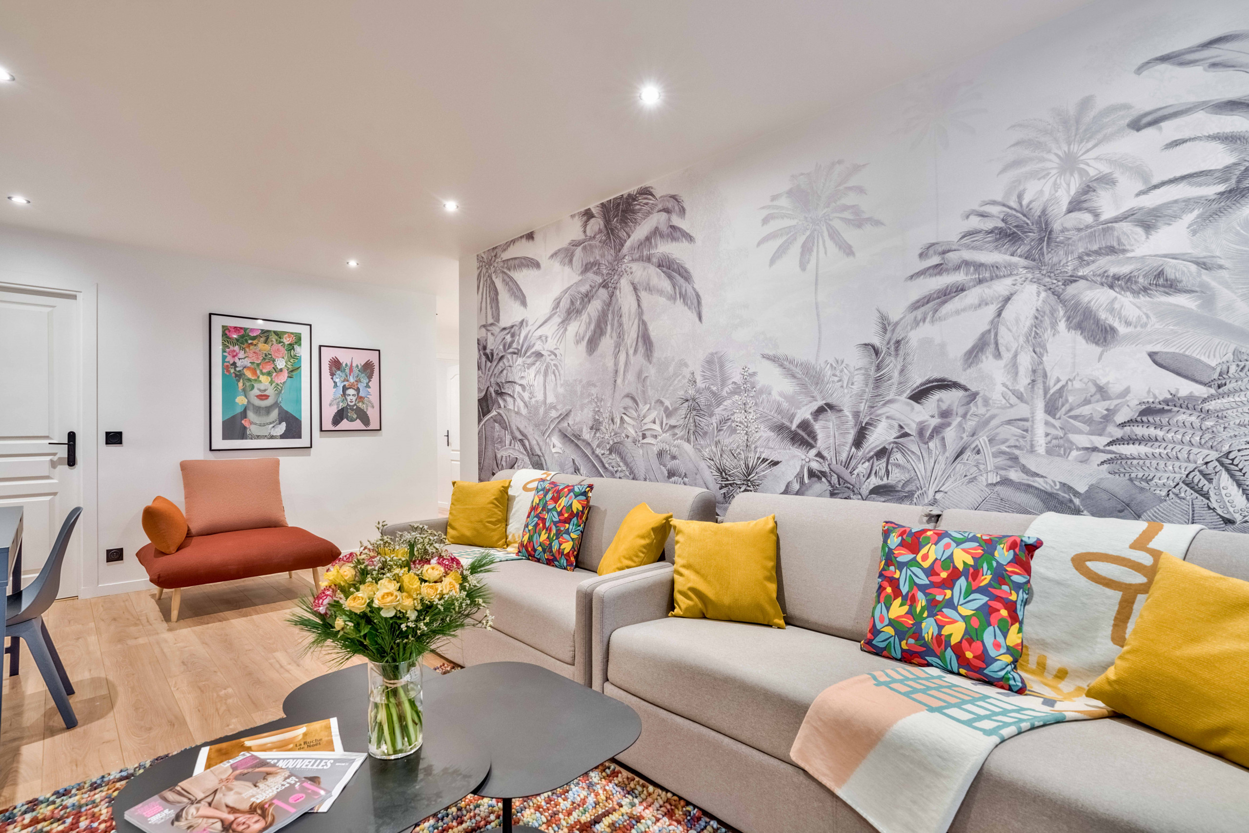 L’utilisation de touches de couleurs vives , une immense fresque representant la jungle, ainsi que les auto-portraits de la peintre mexicaine confèrent à notre appartement, pourtant situé en plein coeur de Paris, une atmosphère chaleureuse, fleurie, et presque tropicale.