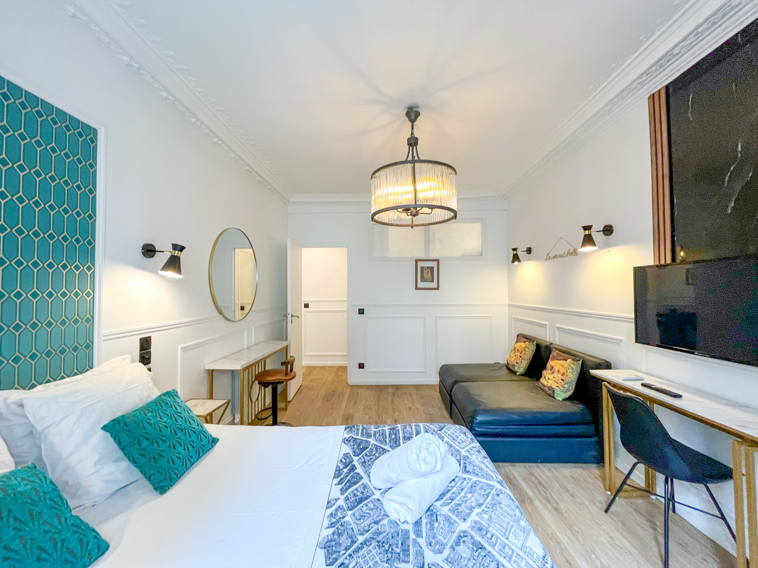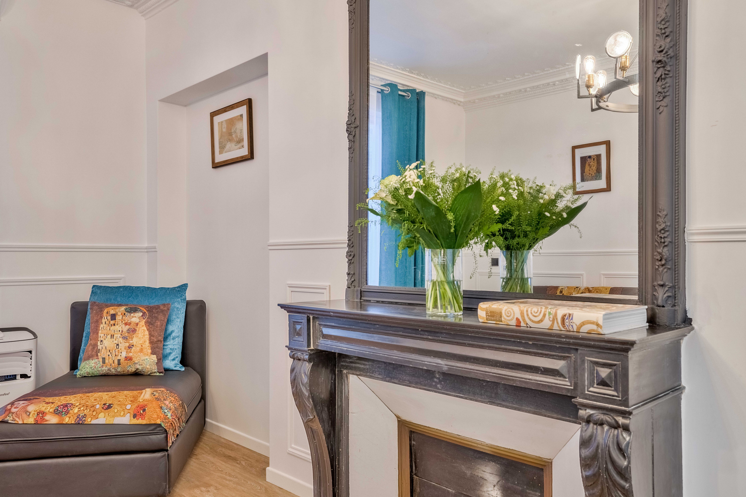 Immediatement apres avoir franchi la porte de notre appartement, vous serez immergé dans un autre monde. Celui du peintre Klimt. Vous retrouverez les oeuvres de l’artistes au salon et dans les chambres a coucher, ainsi que les tons chauds et mordorés qui lui sont chers …