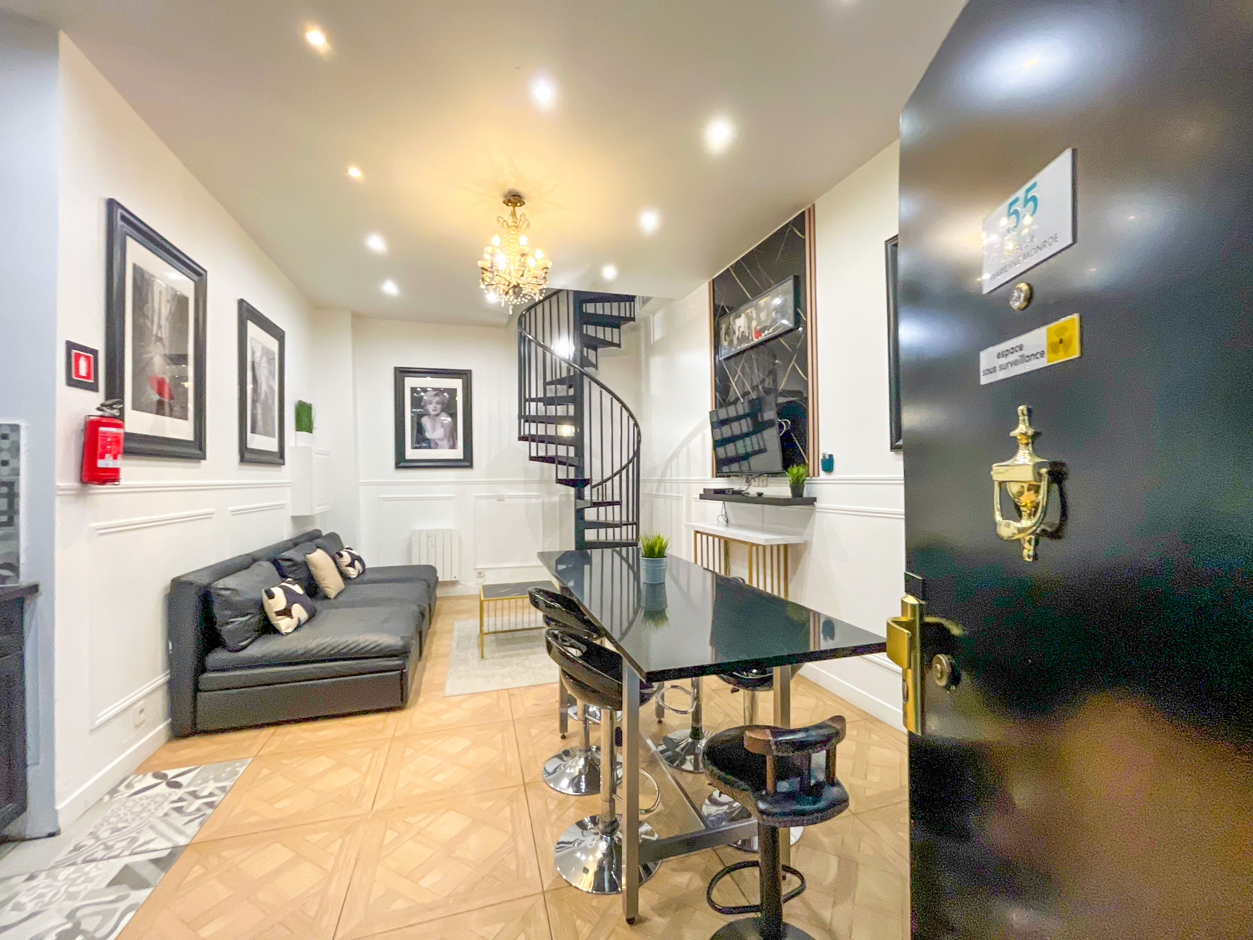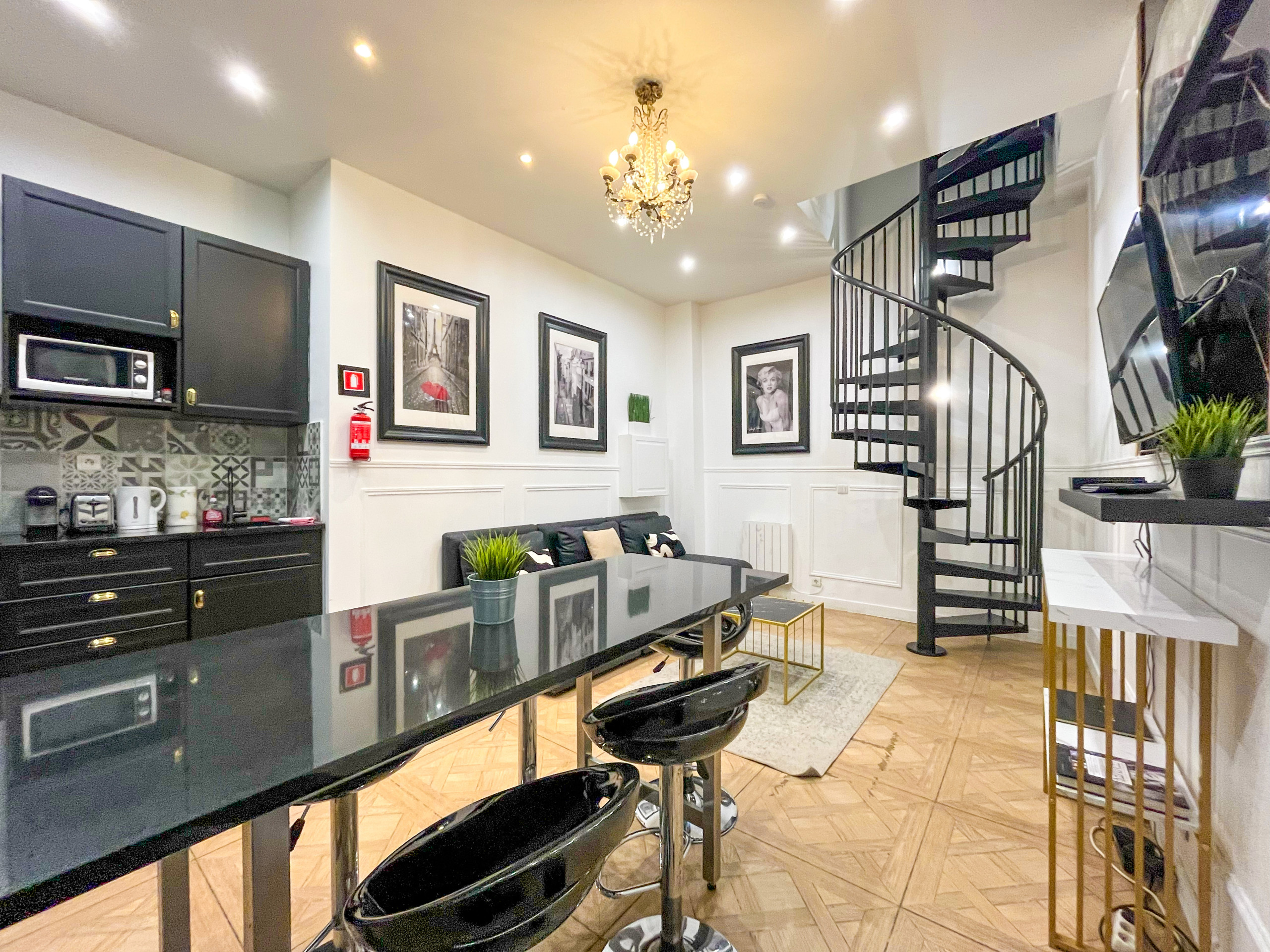 Poupou Pi Dou… Poussez la porte de l’atelier et pénétrez le monde de strass de la diva, montez une à une les marches de l'élégant colimaçon et profitez, à la lumière du lustre à l’ancienne, du panorama sur la belle cuisine americaine et la table d'hôte. A l'étage, deux chambres aux rideaux aussi rouges que le gloss parfait de l'icône donneront à votre séjour parisien une touche So Hollywood.