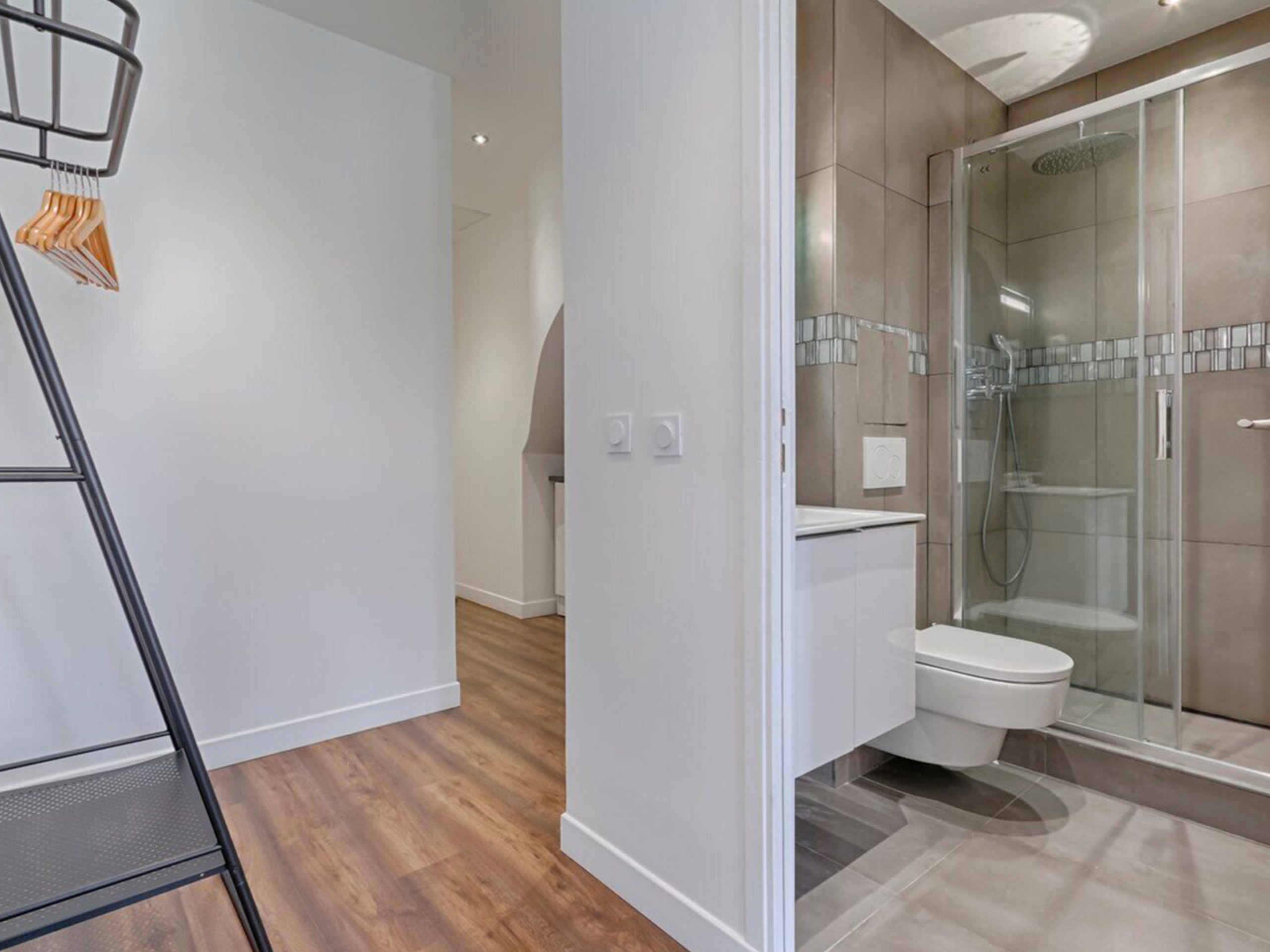 • 现代浴室:功能性大淋浴、柔软大毛巾、沐浴露、洗发水和吹风机一应俱全。卫生间集成设计,简单高效。